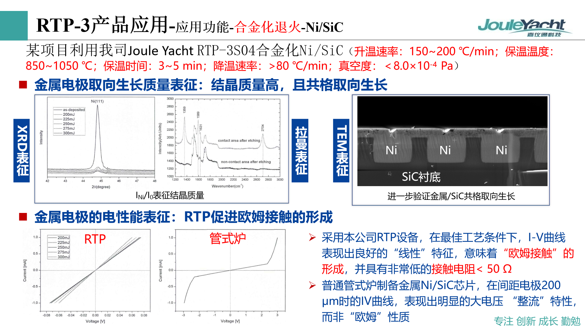 - 实现平直界面:RTP能精确控制热扩散深度,避免金属过度渗入SiC衬底,形成清晰、粗糙度低的金属-SiC界面,有利于电子传输。